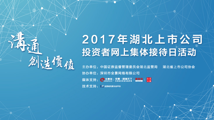 为协助上市公司进一步做好投资者关系管理工作,深圳市全景网络有限公司、湖北省上市公司协会将与中国证券监督管理委员会湖北监管局一起联合举办2017年湖北上市公司投资者网上集体接待日活动。围绕2016年年报、公司治理、发展战略、经营状况、融资计划、股权激励、投资者保护、可持续发展等投资者所关心的问题,通过互动平台与投资者进行“一对多”形式的沟通和交流。