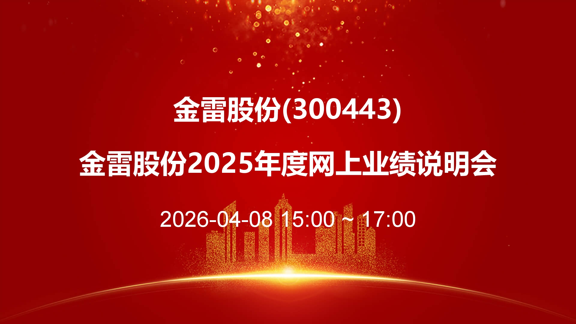 金雷科技股份公司定于2026年4月8日(星期三)下午15:00-17:00在全景网举办2025年度网上业绩说明会,本次业绩说明会将采用网络远程的方式举行,投资者可登陆全景网“ 投资者关系互动平台”(https://ir.p5w.net)参与本次年度业绩说明会。参加本次年度业绩说明会的人员有:公司董事长伊廷雷先生、总经理张振先生、董事会秘书兼财务总监周丽女士、独立董事王建平先生、保荐代表人迟元行先生 。欢迎广大投资者积极参与!