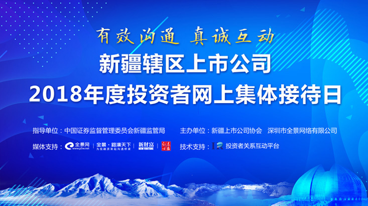 为推动辖区上市公司进一步做好投资者关系管理工作,强化辖区上市公司与广大投资者的日常交流,促进辖区上市公司不断提高透明度和治理水平,在新疆证监局指导下,新疆上市公司协会联合深圳市全景网络有限公司举办“有效沟通 真诚互动——新疆辖区上市公司2018年度投资者网上集体接待日”活动。届时,各上市公司与投资者通过网络在线交流形式,就公司2017年度财务状况、经营成果、公司治理、规范运作、发展战略等投资者所关心的问题,与投资者进行“一对多”形式的沟通,充分展示上市公司诚信、规范的投资者关系管理理念,切实提高上市公司透明度。本场活动仅提供文字图片信息,欢迎广大投资者就所关心问题与新疆辖区上市公司积极交流。
